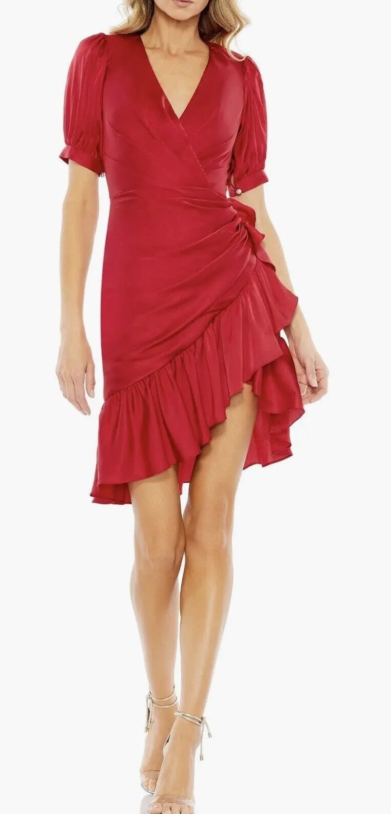 Seam is coming loose can wear with or without repairing Details & care Go for the gloss of a ruffle-decked faux-wrap dress styled with a draped neckline and decked with plenty of ruffles. Surplice V-neck Short sleeves Lined Asian Owned/Founded 100% polyester Spot clean Imported