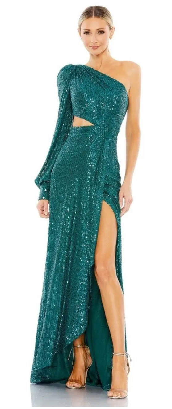 Sequined mesh overlay; 100% polyester lining Fully lined through bodice and skirt; semi-sheer unlined sleeve Asymmetric one-shoulder neckline Single long bishop sleeve Thigh-high front slit Side cut-out Concealed back zipper Approx. 62.5" from top of shoulder to bottom hem Size 6 New with tags on $398