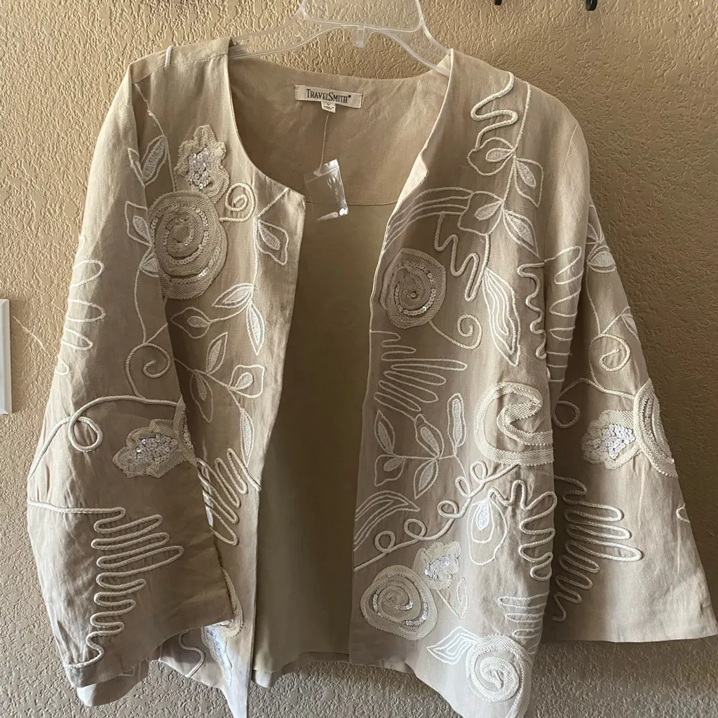 Elegant TravelSmith open-front jacket in a beige linen-cotton blend with tonal floral embroidery and... Show more