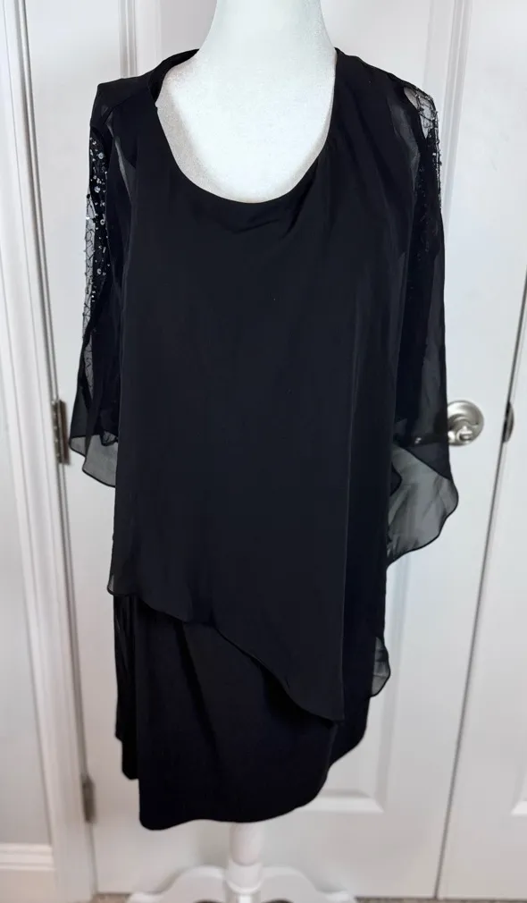 Timeless and elegant Ignite Evenings black evening dress featuring a flowing chiffon overlay and delicate beaded flutter sleeves. This polished silhouette is perfect for Mother of the Bride, Mother of the Groom, formal weddings, cocktail events, cruises, or elegant evening dinners. The soft stretch lining provides comfort while the asymmetrical chiffon layer adds movement and sophistication — flattering, classic, and easy to wear. ✨ Details • Women’s size 12 • Color: Black • Knee-length evening / cocktail dress • Sheer chiffon asymmetric overlay • Beaded mesh flutter sleeves • Fully lined with stretch • Pullover style • Lightweight and elegant drape 📏 Approx. Measurements • Pit to pit: ~22” • Length: ~25” Excellent pre-owned condition. No stains, holes, or missing embellishments. MSRP $119 Perfect for: Mother of the Bride • Mother of the Groom • Wedding Guest • Formal Evening • Cocktail Party • Cruise Wear (Inventory #561