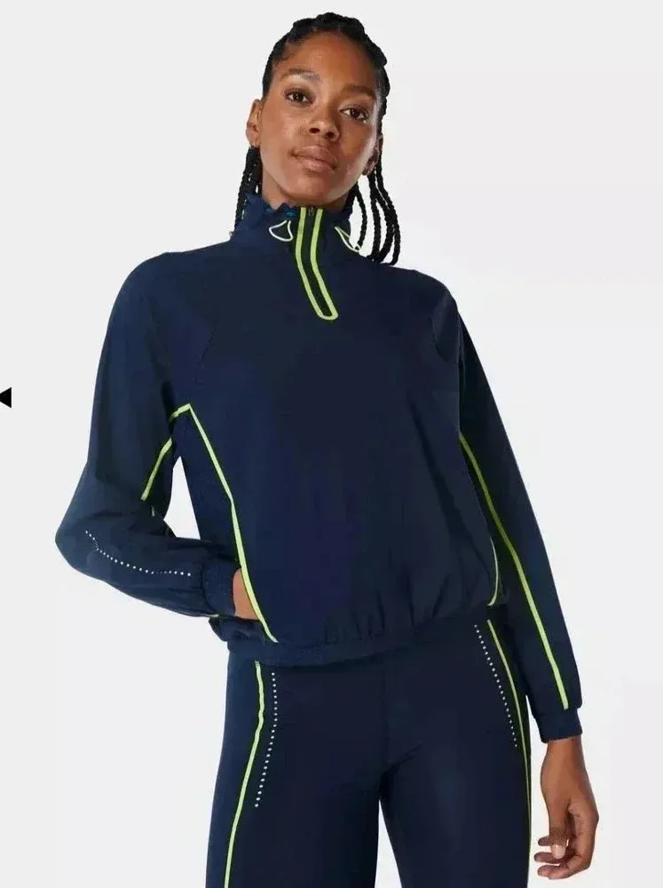 Our new performance layer designed for running. Ultra-lightweight Italian fabric is sweat-wicking and quick-drying. Funnel neck silhouette with breathable panels at the side and sleeves. Features adjustable toggles at the neck and sides and 2 side zip pockets. Elasticated cuffs and hem keep everything in place. Brand: Sweaty Betty Size: S Color: Navy Blue Condition: Excellent pre-owned. Approximate measurements Chest: 42” Length: 21” Ships same/next day