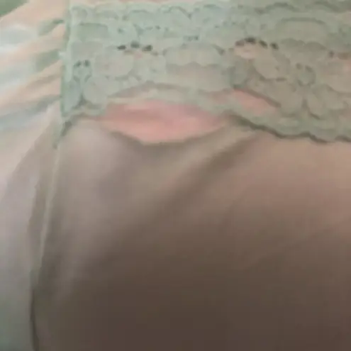 Vanity fair nightgown. Mint green color with lace panel across chest and small pink rose embroidery. Lace along cap sleeves and hemline. There is a small tear along seam by lace panel on the back but could be easily fixed. Tag is completely washed out but based on measurements this is equal to a size small Pit to pit 19.5” Shoulder to hem 38”