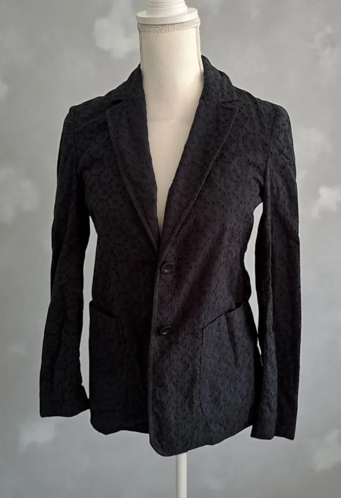 Elevate your wardrobe with this chic SEE BY CHLOE black blazer. Featuring elegant eyelet details, this long-sleeve jacket in size US 4 is perfect for versatile styling. Ideal for adding sophistication to any outfit. • Black eyelet design • Long sleeves • Size US 4 • Versatile styling • Chic and elegant Condition: Pre-Owned Good Features: • Jacket Size: Womens 4
