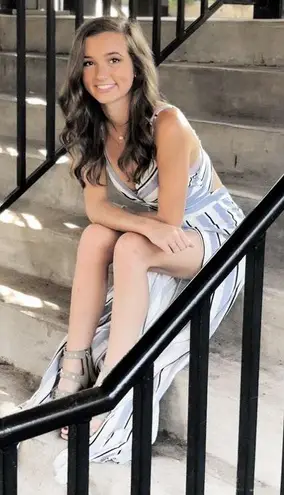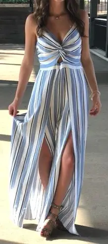 Blue, black and white striped romper, pants slit open, worn once for senior pictures.