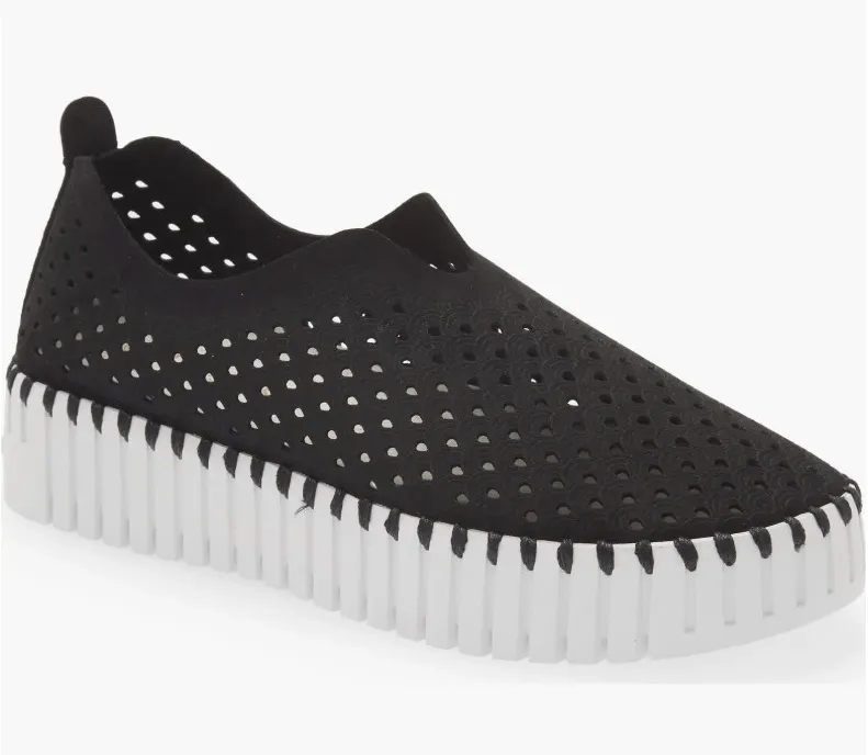 Ilse Jacobsen black perforated slip-on shoes, size 37. These stylish shoes feature a unique all-over perforated design and a distinctive white sawtooth sole. The slip-on style offers easy wear and a comfortable fit, perfect for casual outings or travel. Style: Slip-On Department: Women Type: Casual Upper Material: Fabric AU Shoe Size: 7.5 UK Shoe Size: 4.5 EU Shoe Size: 37 Lining Material: Fabric Insole Material: Fabric Pattern: Geometric Outsole Material: Synthetic Closure: Slip On Shoe Width: Standard Features: Breathable, Comfort Heel Height: Flat (Under 1 in) Keywords: Ilse Jacobsen, perforated, slip-on, sneakers, ballet flats, casual, travel, comfort, European size, European shoes, breathable, lightweight, athleisure