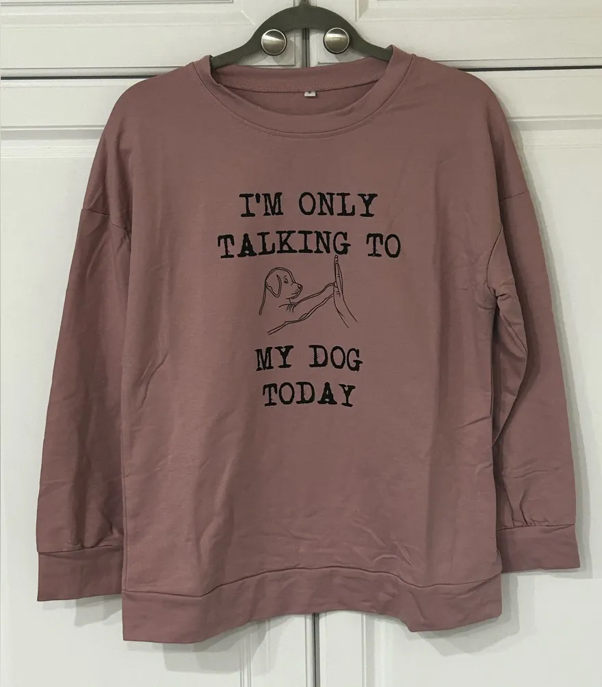 NEW in Packaging - Women's Funny Size Small long sleeve Lightweight Sweatshirt with black lettering reads "I'M ONLY TALKING TO MY DOG TODAY" B 60% Polyester / 35% Cotton & 5% Spandex PTP Approximately 20" / Machine Wash Note: Color may differ from how they appear in the posting due to camera lighting Thank you for checking out my listing 💕 Box 8
