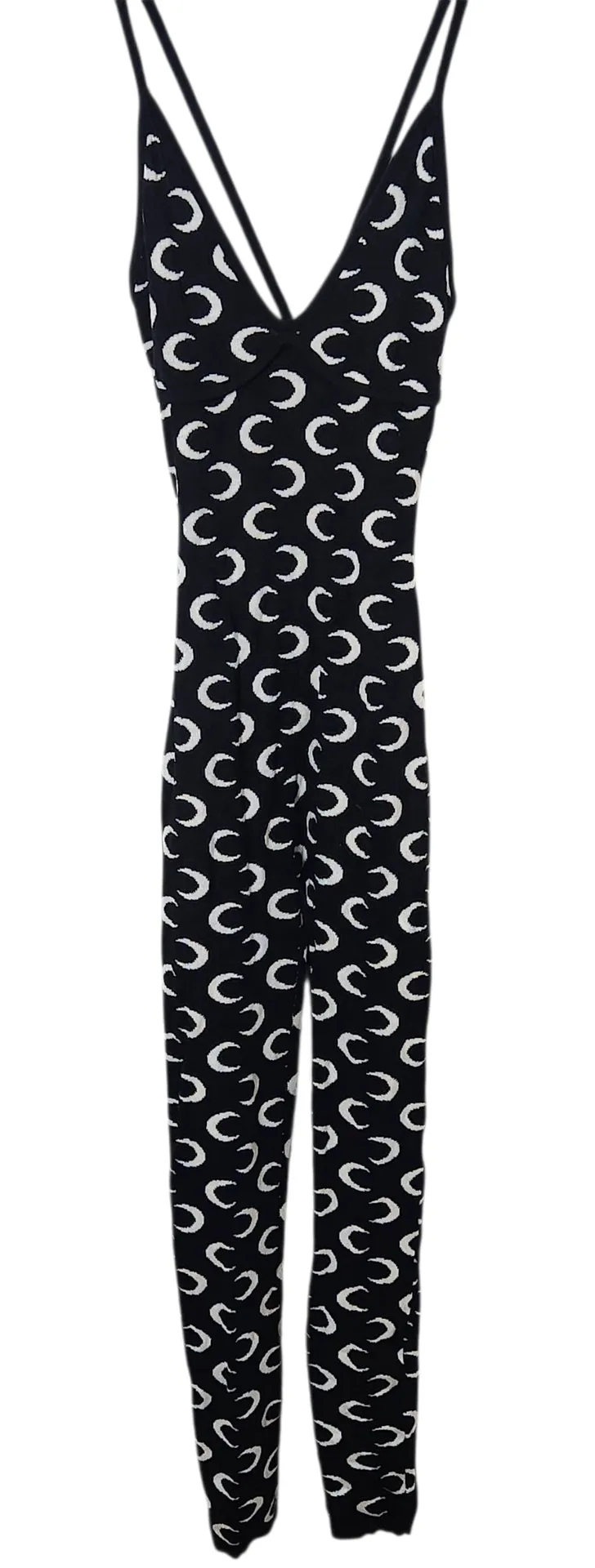 Make a statement in this IMmodel black and white moon print jumpsuit. Crafted from soft knit fabric similar to a sweater, it features a fitted bodycon silhouette, strappy style, and skinny legs for a sleek look. Size Medium with pull-on style and new with tags (NWT), this jumpsuit is ideal for cozy yet stylish at-home or casual outings. Brand: IMmodel Size: Medium Style: Knit bodycon jumpsuit with strappy style Color: Black and white moon print Fabric: Soft knit, sweater-like Condition: New with tags (NWT) Same-day shipping for orders received on weekdays by noon CST. Measurements are shown in images. 2511-171