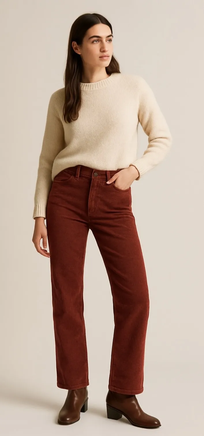 Please note: Model images are AI generated and used for styling reference only. Heritage, Americana, Minimalist, Elevated Basics, Workwear, Cozy, Earthy, Classic, Academic, Urban Casual, Clean Girl, Quiet Luxury, Retro, Twee, Artisanal •Bottoms- Measurements are waist, rise and inseam. •Colors may vary slightly due to lighting and angle. Imogene and Willie, Amelia pants, Corduroy, Russet pants, Textured fabric, Straight leg, High quality, Boutique brand, Artisan denim, Heritage style, Classic fit, Cozy corduroy, Warm tones, Premium basics, Quiet luxury pants, Academic style, Earthy fashion, Retro inspired, Elevated essentials, Artisanal clothing, button fly
