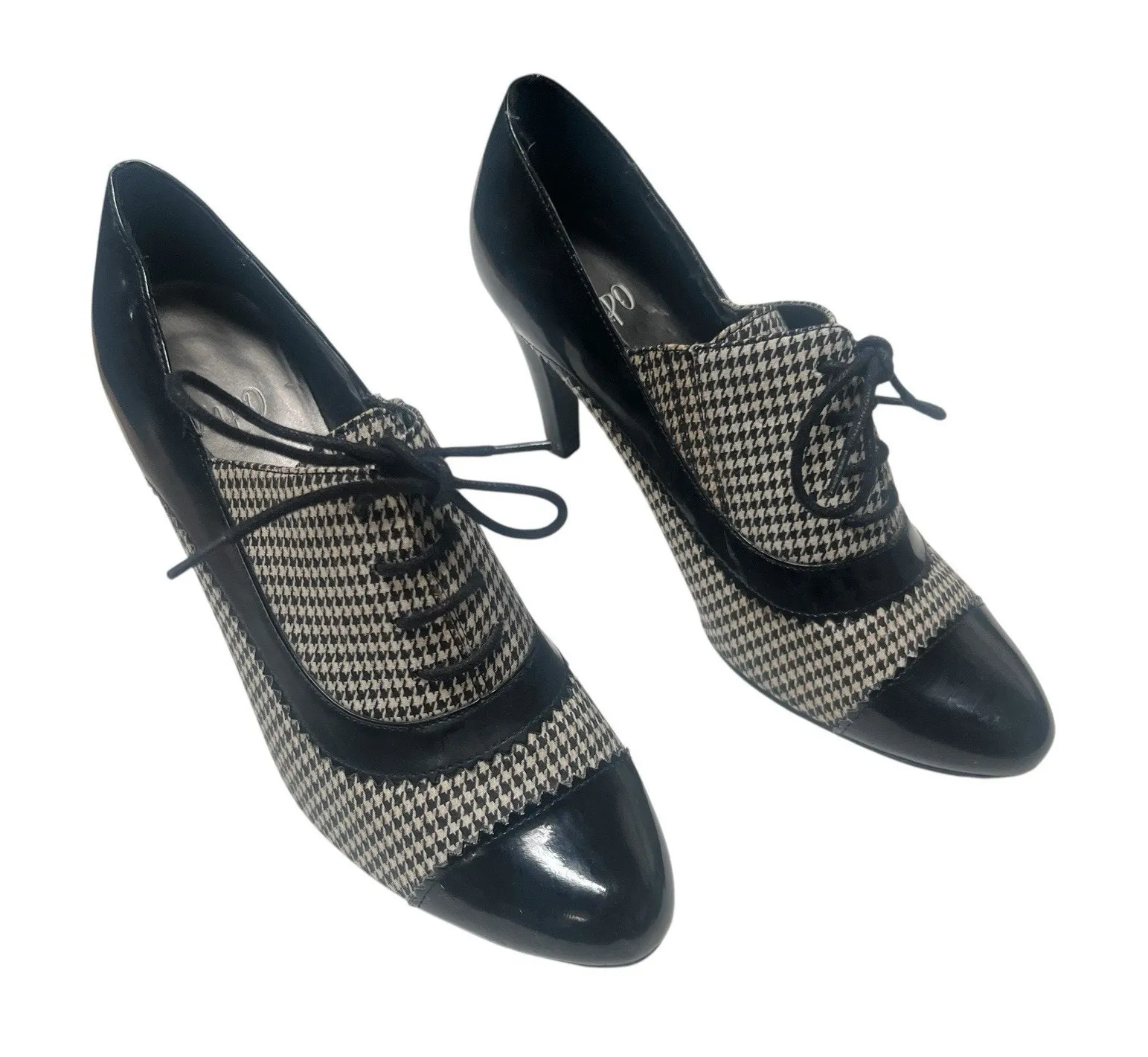 The IMPO Women's Patent Taupe Houndstooth Oxford Pumps are stylish and versatile heels perfect for various occasions. With a classic lace-up closure and almond toe shape, these pumps feature a stiletto heel for added elegance. Made from patent leather with a comfortable outsole, these shoes are suitable for all seasons and come in a size 9. The houndstooth pattern adds a trendy touch to the design, making them a unique and fashionable choice for any occasion Good used condition - minor scratches on patent leather but nothing major #90’s#Y2Kesthetic#party#office#classic#pinup