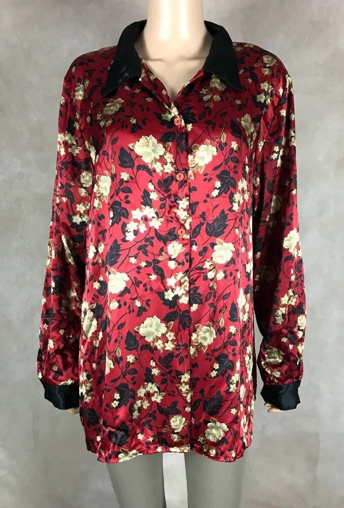 IMPRESSIONS Vintage Red Oriental Floral Satin Long Sleeve Lounge Pajama Shirt 100% Satin Polyester... Show more