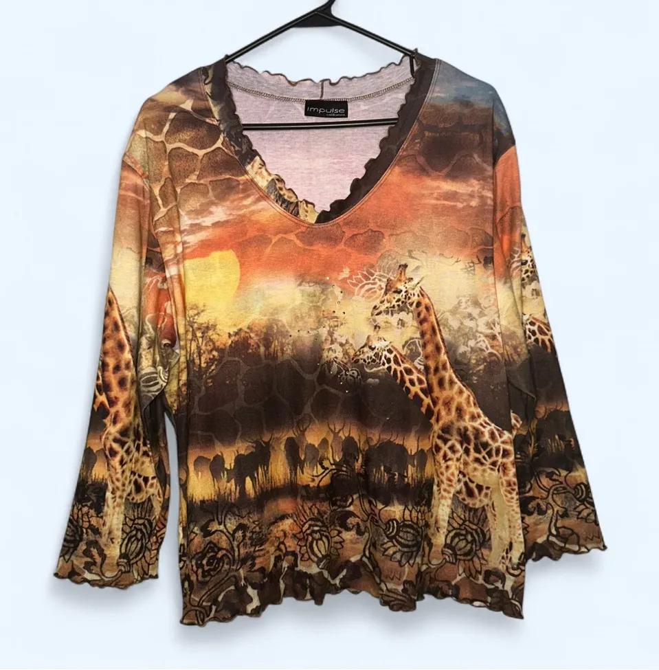 Super cute unique top! No size tag so check out the measurements! Chest is 23.5” would probably fit a 2X/3X Impulse California Giraffe Lettuce Trim Long Sleeve Top Savanna Wildlife Animals