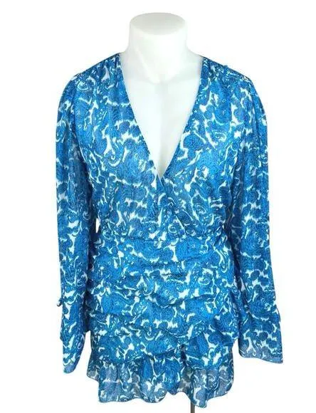 In The Style Blue Paisley Long Sleeve Ruffle Tiered Faux Wrap Mini Fit & Flare Dress Size 20 Size:... Show more