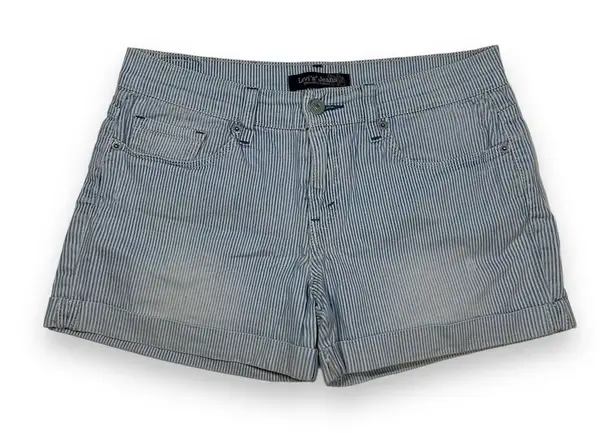 blue and white pinstripe design with thick back pocket stitching. Good preowned condition, no rips... Show more
