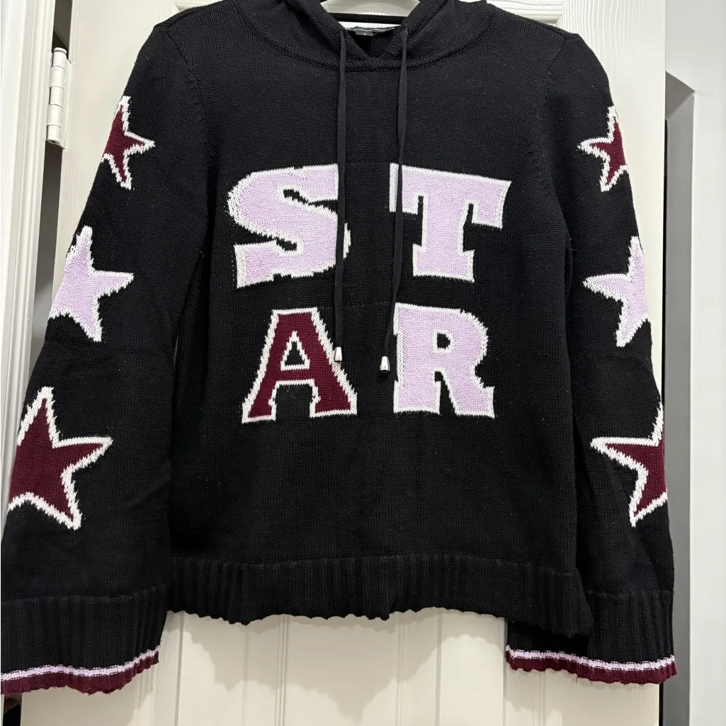 Casual black sweater like hoodie with bold stars and STAR lettered pattern w/bell sleeves. Pair with... Show more