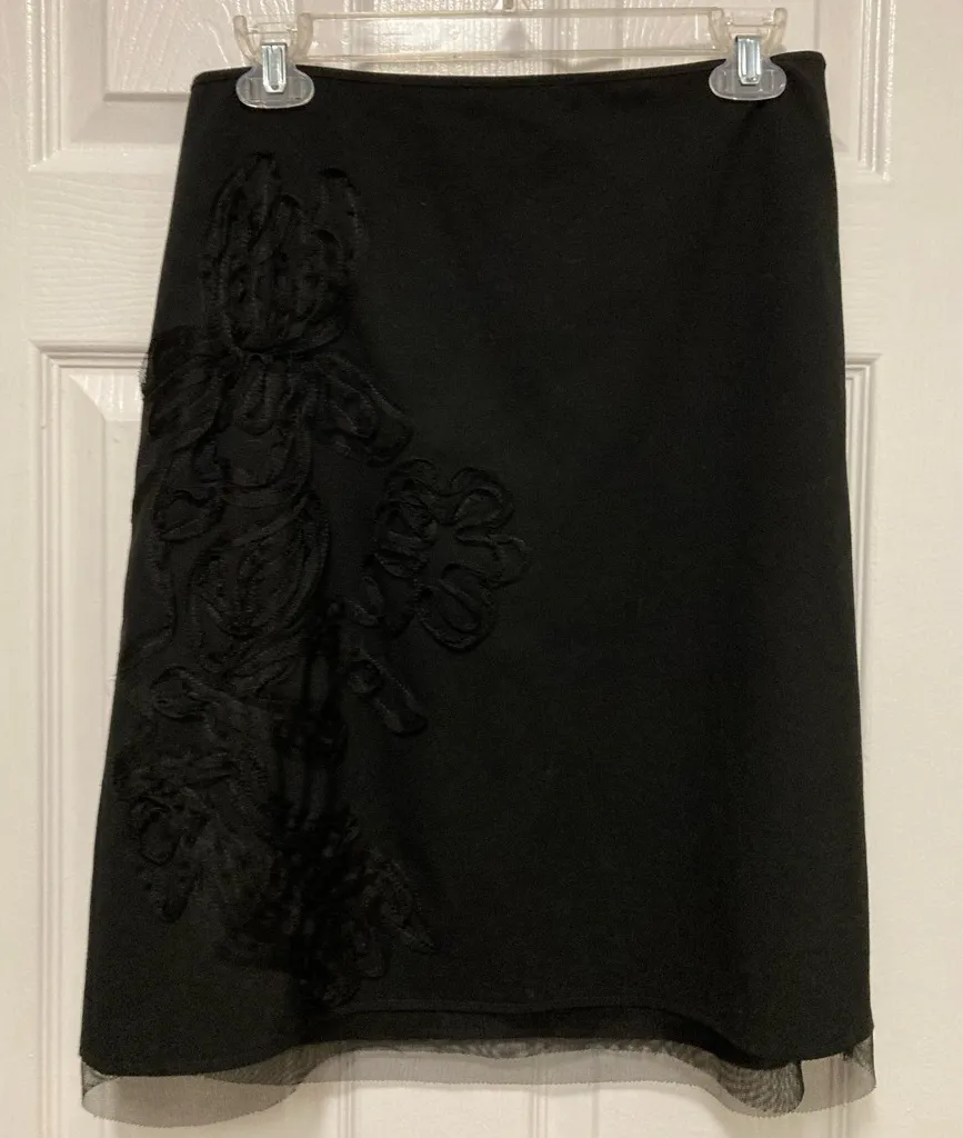 Great Condition Button Zipper Closure Lined Black Raised Floral Appliqué on Left & Back Black Mesh Hem 63% Polyester/32% Rayon/5% Spandex Waist: 14.5” Length: 21.5” Length to Lace: 22.5” Size 4