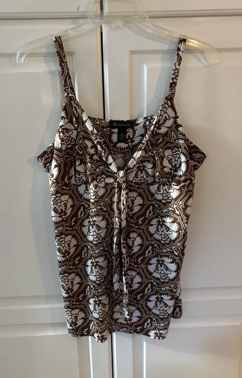 Elevate your warm-weather wardrobe with this chic INC International Concepts cami. The rich brown and white floral print creates a captivating visual, while the flattering V-neckline and knotted front add a touch of stylish detail. Adjustable spaghetti straps ensure a perfect fit, offering both comfort and a flattering silhouette. This versatile top is ideal for a casual brunch with friends or a relaxed evening out. Length 29" pit to pit 21" Type: Tank Department: Women Style: Camisole Material: Polyester, Spandex Neckline: V-Neck Sleeve Length: Sleeveless Sleeve Type: Strappy Sleeve Pattern: Floral Accents: Strap Features: Keyhole Neck Fit: Regular Fabric Type: Knit Occasion: Casual, Party/Cocktail Closure: Pullover Season: Spring, Summer Keywords: cami, tank top, floral print, knot front, V neck, brown white, adjustable straps, summer, casual, going out, brunch, women's fashion