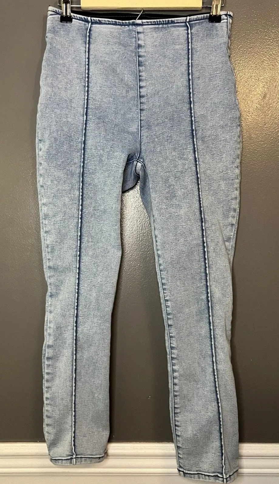 Pre-owned gently worn condition. Fabric is clean and stretchy with no stains, holes, or fraying. Seams and hems intact and color even throughout. Brand: INC International Concepts (INC Denim) Style: Womens pull-on skinny jeans/jeggings with a light wash blue denim look. Color: Light wash blue Size on tag: US 4 / 27 Material: 57% cotton, 22% viscose, 20% polyester, 1% spandex (per tag). Made in Jordan. Details: High-rise elastic waistband, pull-on style with no button or zipper closure, vertical seam detailing down the front and back of each leg for a lengthening effect, slim leg silhouette with ankle-length inseam, soft stretchy denim knit for comfort. Waist 26 Rise 13 Inseam 26 bin 90 2317