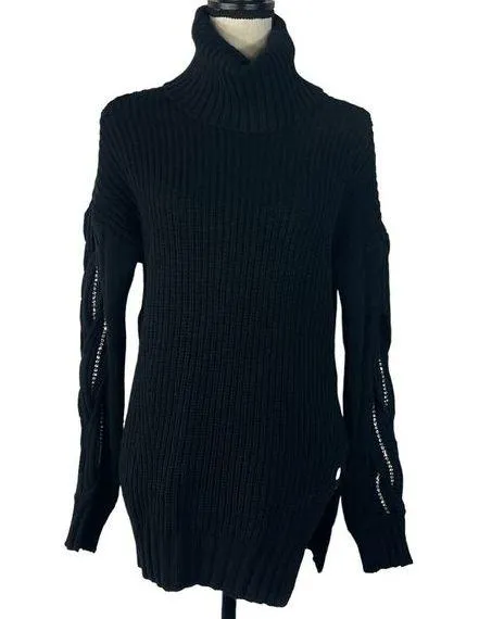 INC International Concepts Small Sweater * Cowl Neck * Rhinestones Embellished Sleeves * Wide Side Slit * Long Sleeve * Black Please check measurements to ensure proper fit. Bust: 40" Length from under the arm to the hem: 26 1/4" Wide Side Slit: 8" Measurements are approximate, laying flat and unstretched. Smoke free home.
