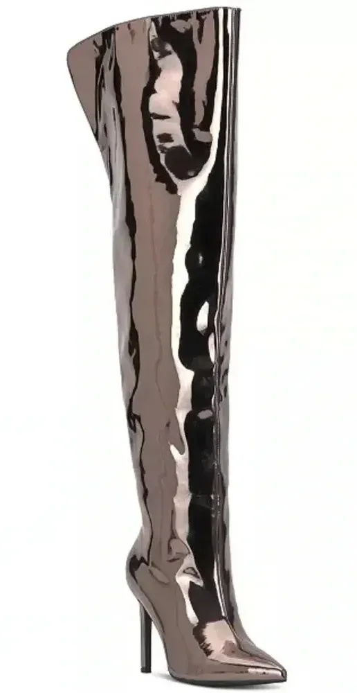 Good condition!! Some wear with age and some slight creasing (pictured) but not noticeable unless looked at up close :) No Longer sold !! A stunning over-the-knee silhouette in sleek metallics tops chic pointed toes and stiletto heels in the eye-catching Sedona boots from I.N.C. International Concepts®. 3-3/4" stiletto heel Shaft height: 21-3/4"; Circumference: 16-1/3"; measured on a size 6 Pointed toe Functional inside zip Breathable lining and lightweight, flexible sole for added comfort; slip-resistant sole for added traction NOTE: Shaft height and circumference vary by size. Manmade upper; fabric, manmade lining; manmade sole Imported