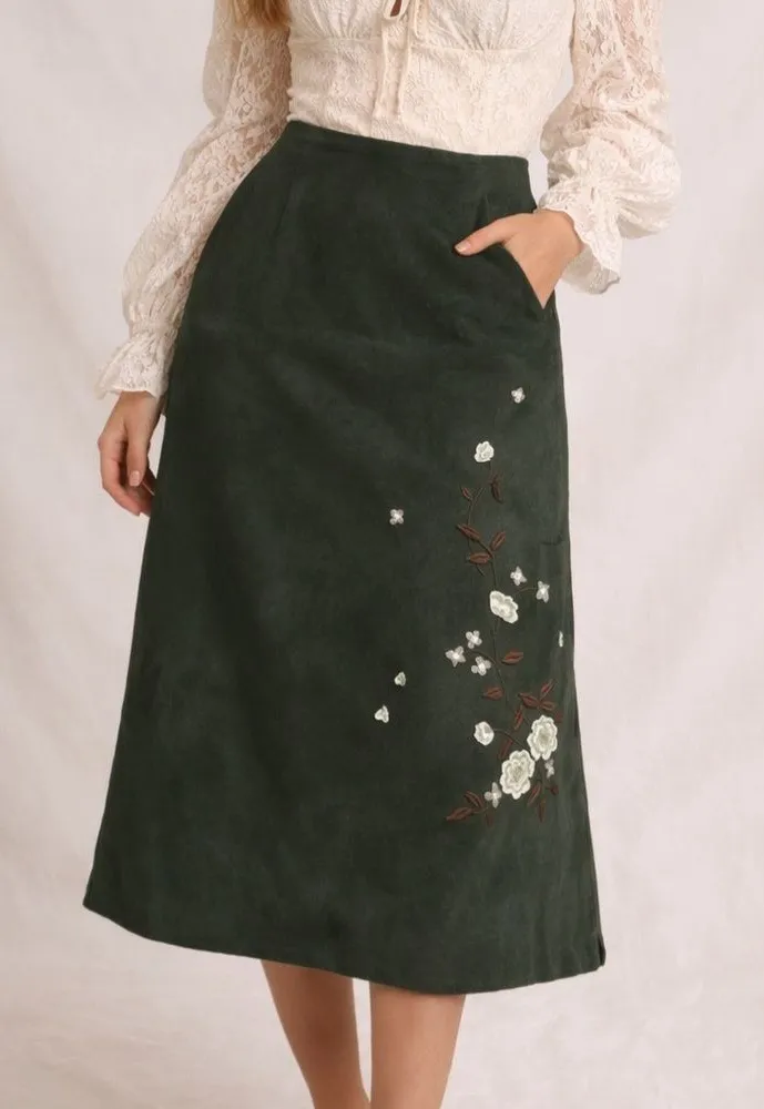 Dreamy and earthy, this vintage INC green suede midi skirt is a true forest fairy / goblincore gem. Crafted in a rich deep green suede with delicate floral embroidery, it channels late 90s–early Y2K cottagecore with a romantic, woodland twist. The midi length and soft structure create a flattering, timeless silhouette—perfect for pairing with peasant blouses, lace camisoles, corset tops, or chunky knits. Ideal for lovers of coquette, gremlin, goblin, and peasant aesthetics, this skirt transitions beautifully from fall layering to spring fairy-core styling. A rare, elevated vintage piece with whimsical detail. Forest Fairy · Goblincore · Gremlin · Goblin · Coquette · Cottagecore · Peasant · Boho · Woodland · Fairycore · Dark Cottage · Earthy · Vintage Y2K · 90s Vintage · Whimsical · Romantic · Indie #VintageSkirt #INCVintage #SuedeSkirt #ForestFairy #Goblincore #GremlinCore #CottagecoreFashion #CoquetteStyle #PeasantStyle #BohoVintage #Y2KFashion #90sVintage #Fairycore #WoodlandAesthetic