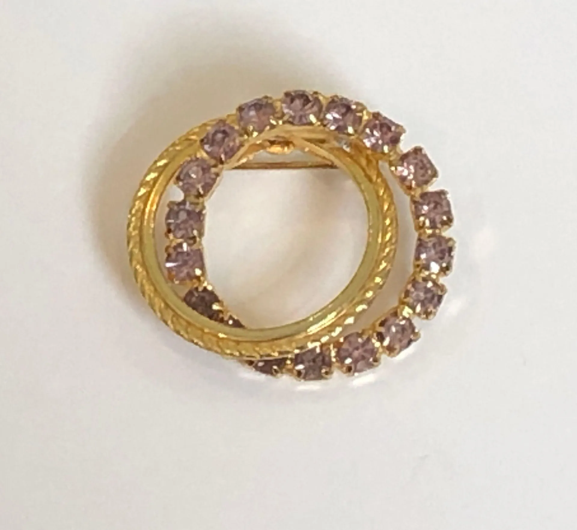 BEAUTIFUL VINTAGE BROOCH INTERTWINED CIRCLES ONE IS A DETAILED GOLD TONE THE OTHER IS A CIRCLE FULL OF DAZZLING PURPLE RHINESTONES THIS REMARKABLE BROOCH MEASURES 1 3/8" X 1 1/4" GORGEOUS!!!!! IN EXCELLENT VINTAGE CONDITION
