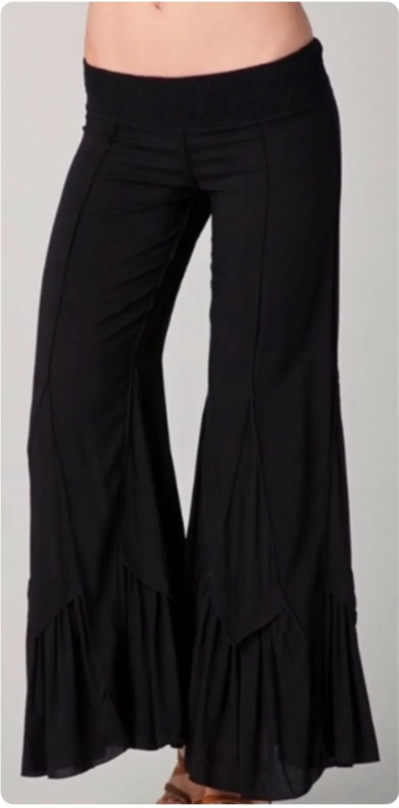 Indah Black Ruffle Wide Leg Flare Pants Womens Size S Smocked Waist Boho Chic Good preowned conditi... Show more