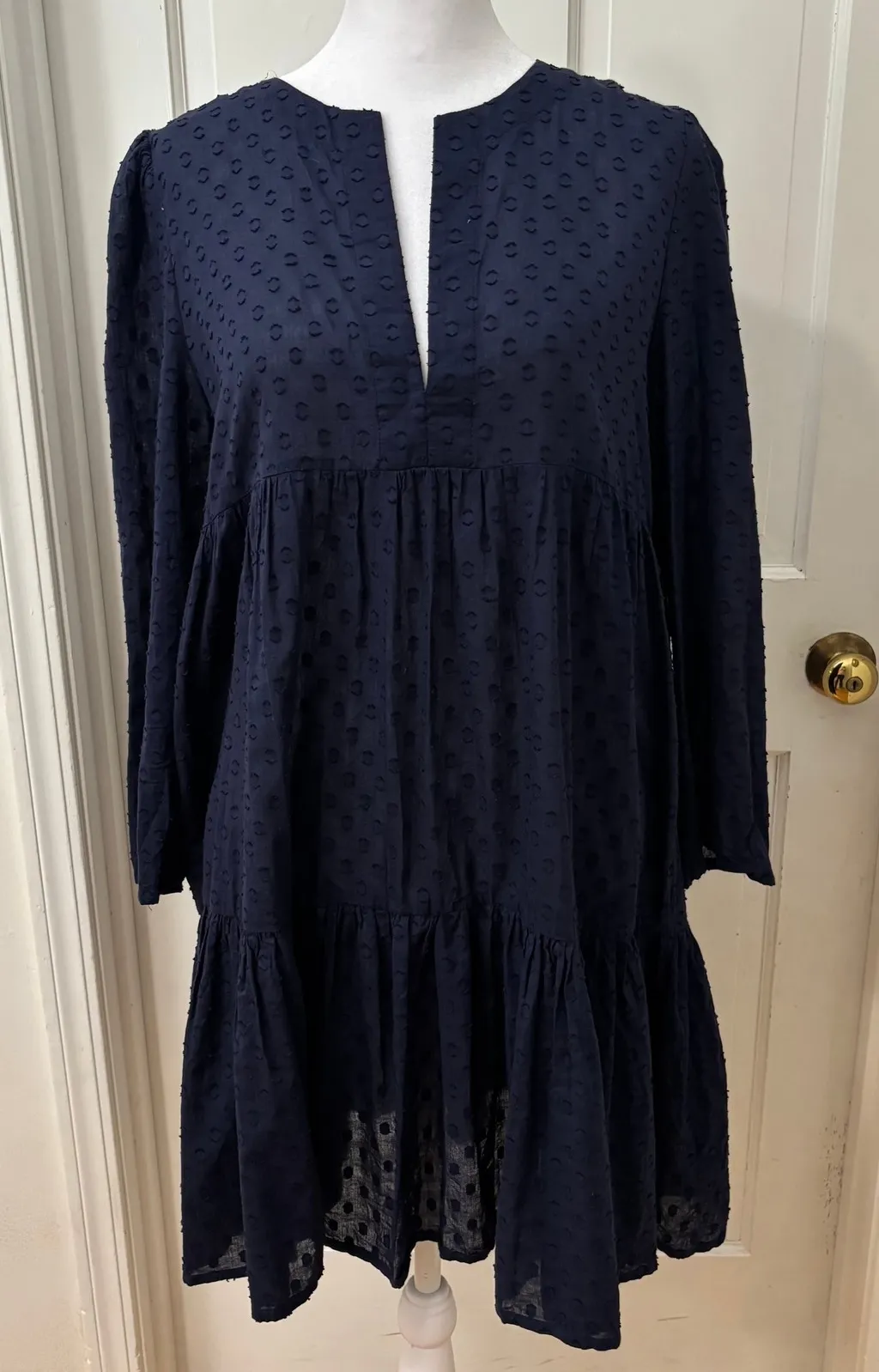 Style: Tiered, Prairie Dress Length: Short Department: Women Sleeve Length: Long Sleeve Pattern: Polka Dot Occasion: Casual Material: Cotton Neckline: V-Neck Fabric Type: Woven Season: Fall, Spring Sleeve Type: Puff Sleeve Closure: Pullover Semi Sheer Keywords: India Collection, Emerson Fry, Navy Blue Dress, Dot Dress, Textured Dress, Tiered Dress, Mini Dress, Bohemian Dress, Cotton Dress, Casual Dress, Womens Dress, Size M Dress, Long Sleeve Dress, minimalist, Nautical, Old Money Pit to pit: 21" length from shoulder: 35" Measurements are unstretched and approximate. Ships quickly!