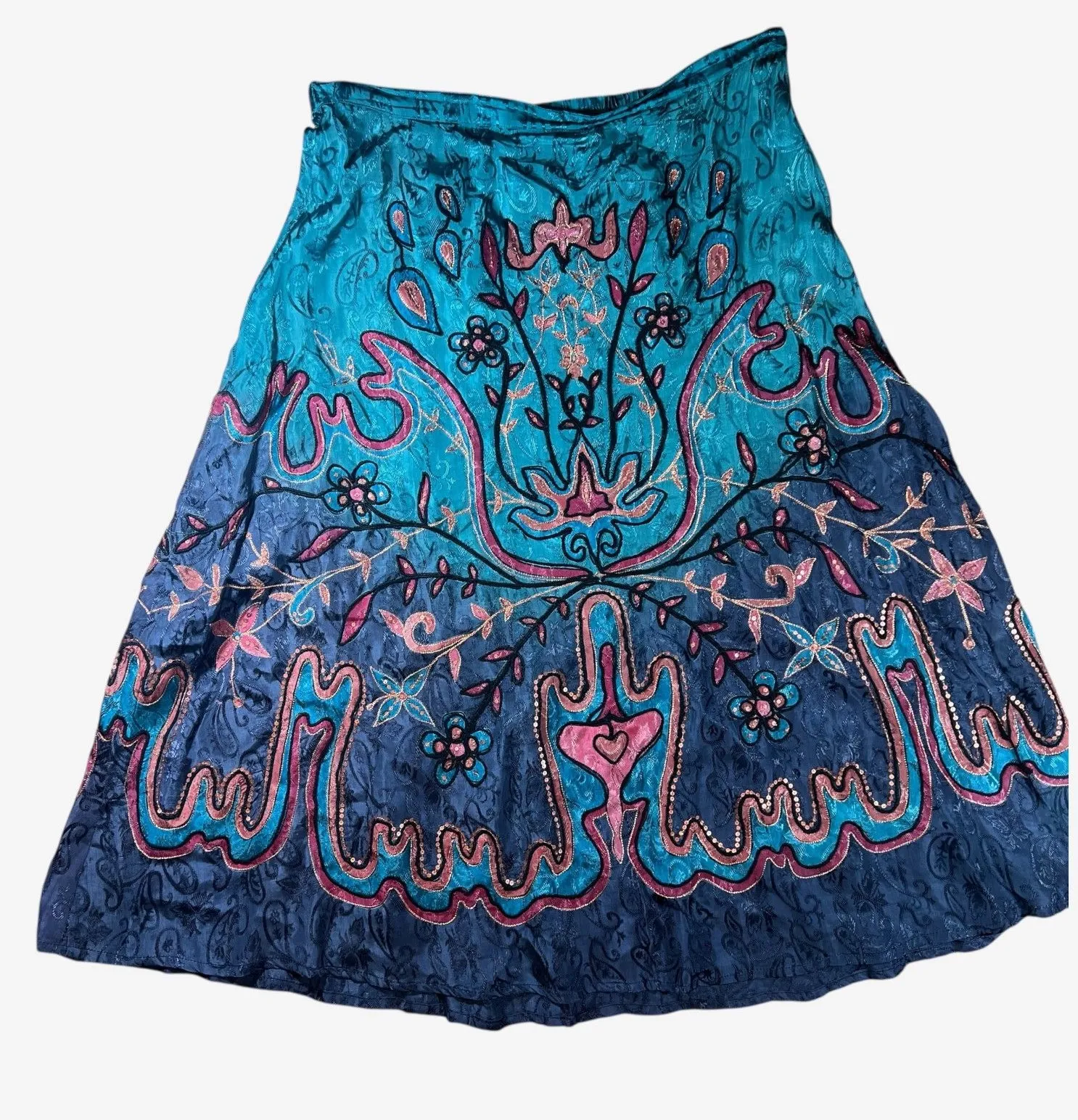 Indigo Moon aline midi skirt Boho Teal & Copper Rayon Jacquard Skirt Gorgeous A-line skirt in rayon jaquard teal and blue, red accents copper embroidery and sequins Crinkle texture for a relaxed, flowy fit. Perfect for festival, its a boho look for fall, think boots denim jacket, southwestern colors, Material: 100% Rayon Jacquard Colors: Teal, Copper, blue Pattern: Floral & Paisley Embroidery Fit: A-line, mid-length flat front, elastic back, side zip with button waist 18 inches taken flat length 33 inches Match these measurements with a similar item in your closet that fits just right for the best fit!