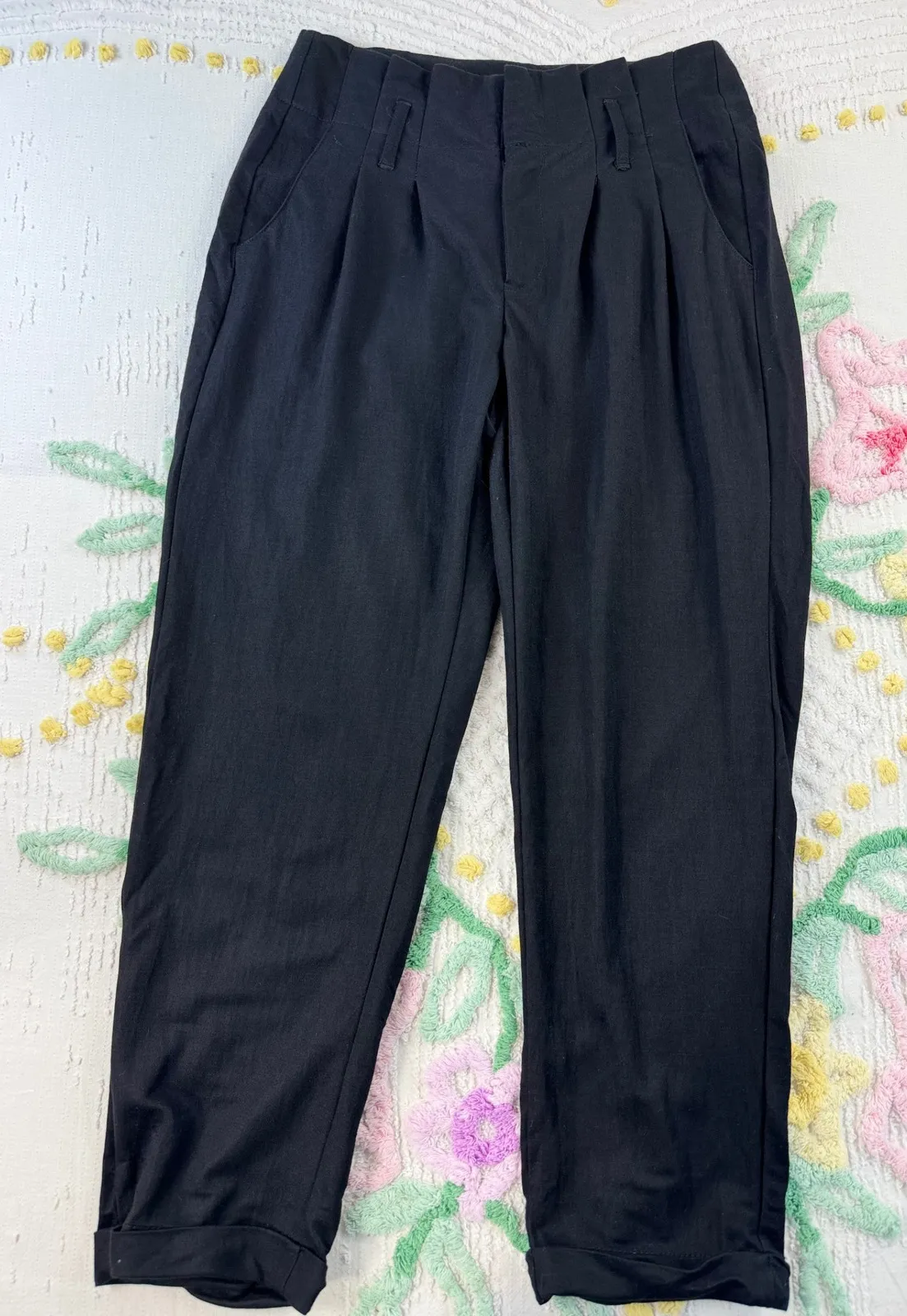Elevate your everyday style with these sophisticated Indigo Rose trousers, designed to flatter and move with you. The impeccable tailoring features a flattering high waist and elegant pleats that create a refined silhouette, while the relaxed fit offers exceptional comfort. These versatile pants seamlessly transition from a polished office look to a chic evening ensemble. Perfect for the modern professional seeking both style and ease. Measurements: • Waist: 13 in • Inseam: 28 in Style: Dress Pants Department: Women Material: Rayon, Nylon Leg Style: Tapered Type: Pants Fabric Type: Crepe Features: Pockets, Cuffed, Stretch, Wrinkle Resistant, Easy Care Closure: Button, Zip Pattern: Solid Accents: Pleated Occasion: Casual, Workwear, Business Inseam: 30 in Front Type: Pleated Season: Fall, Spring Keywords: pleated trousers, high waisted pants, black pants, workwear, tailored trousers, casual pants, business casual, smart trousers, minimalist, classic, comfortable, staple, wardrobe essential