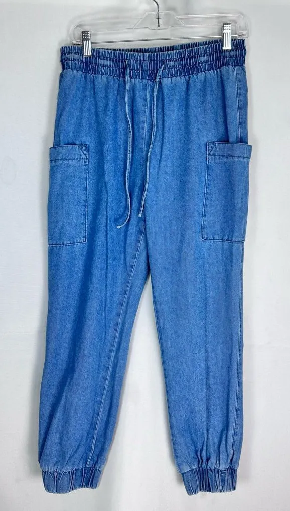 . denim cargo jogger pants, which combine the look and feel of denim jeans with the comfort of joggers and the utility style of cargo pants. They typically feature an elastic or drawstring waistband, side cargo pockets, and elasticized ankle cuffs. Size Large Measurements approximately Waist 15” Rise 12” Inseam 25” Condition Very good condition
