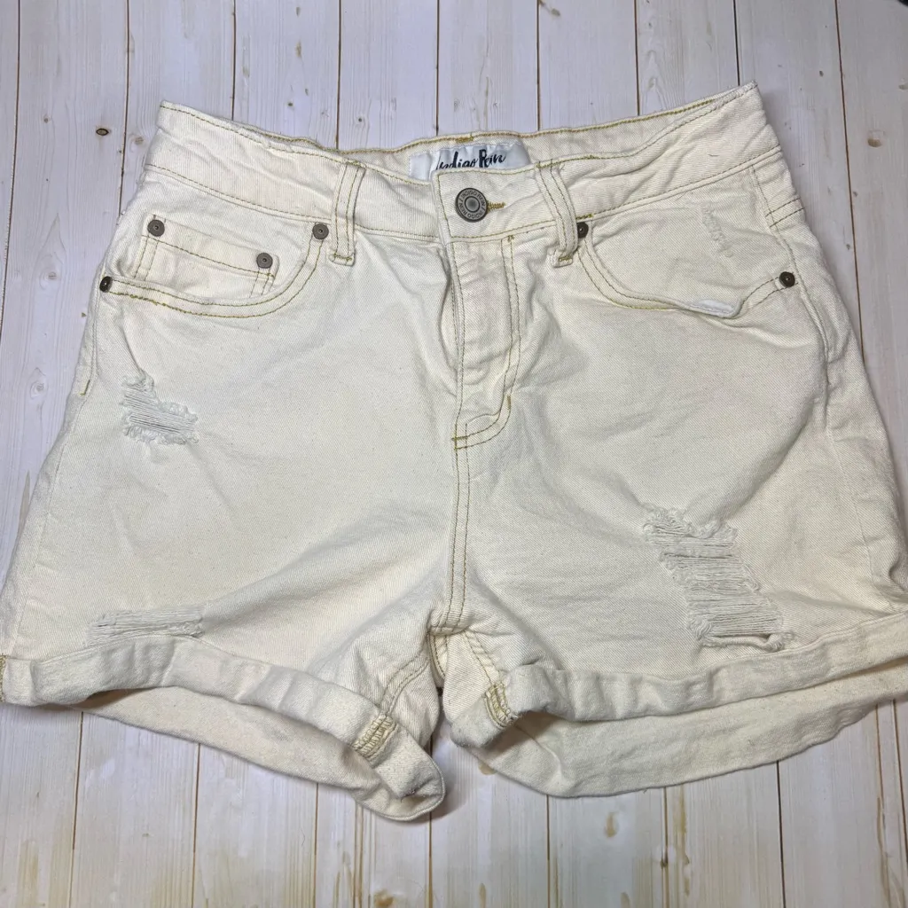 Stylish off-white jean shorts by Indigo Rein. Features subtle distressed accents. Ideal for everyday... Show more