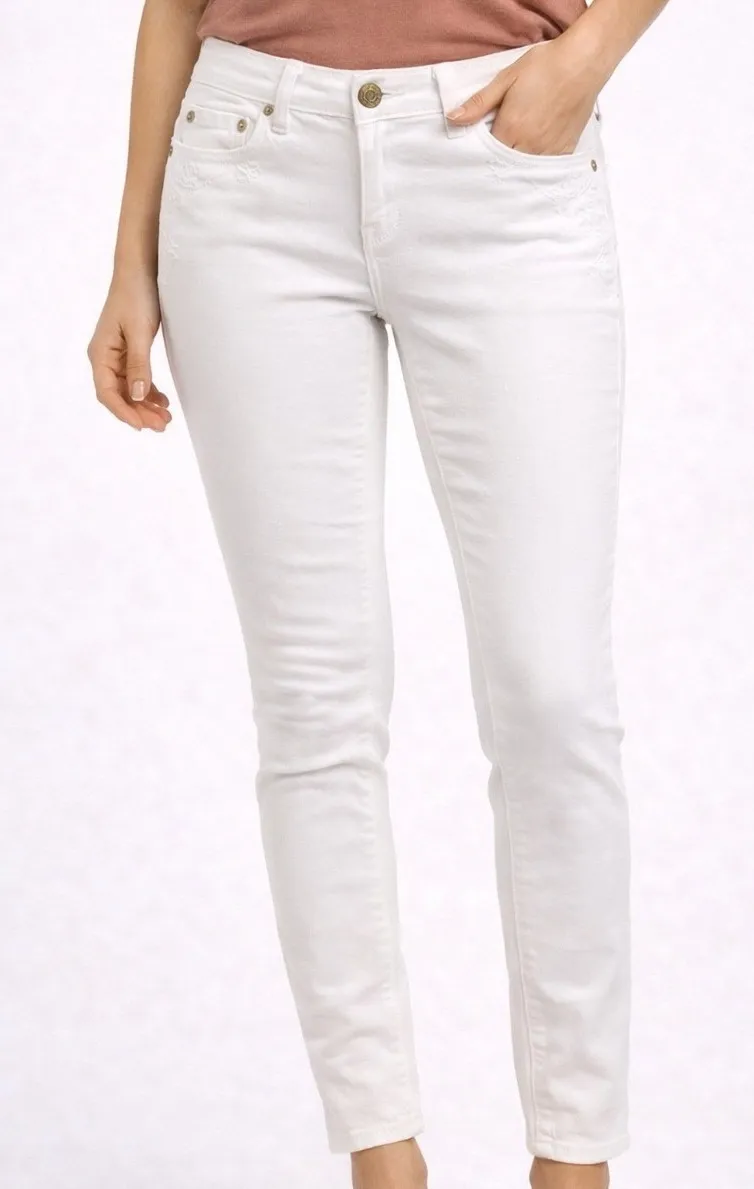 Indigo Rein skinny jeans in a crisp white hue with subtle distressed detailing and delicate embroide... Show more