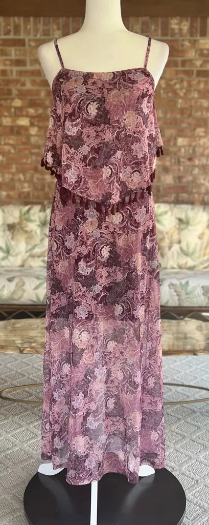 Indigo Thread Co. Burgundy Floral Pom Flounce Maxi Dress ~ very stretchy ~ partially lined ~ mesh... Show more