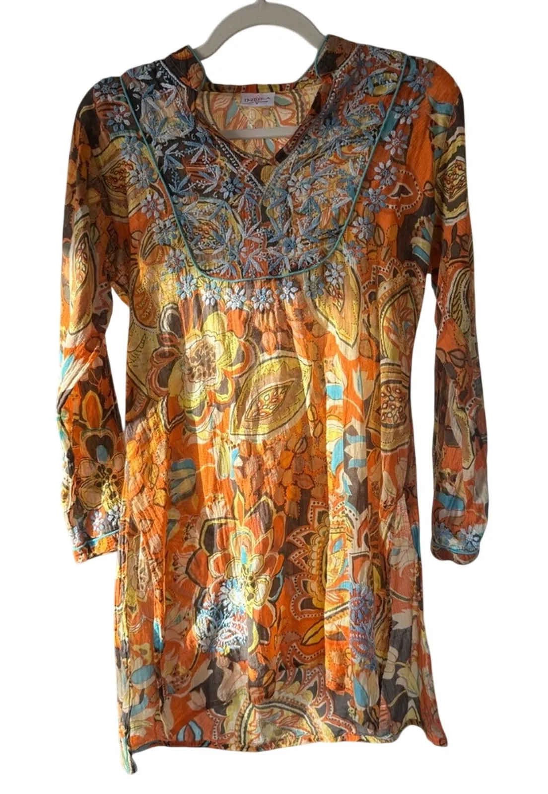 Indika Colorful Embroidered Paisley Floral Long Sleeve Tunic 100% Cotton Orange - $32 - From Stephanie