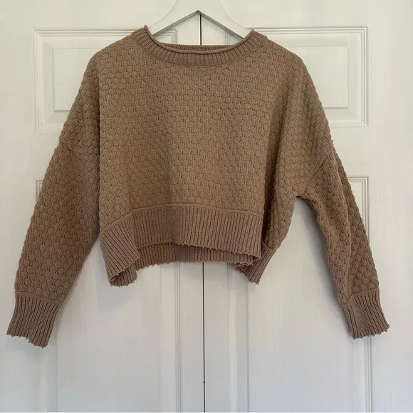 Size XS but could fit up to a Mediuim (it’s an oversized XS) Color: Tan This sweater is amazing quality, well made. Zero flaws. Like new It’s so flattering just doesn’t fit me anymore Could fit a small or medium depending how you want it to fit. XS is oversized Pet/smoke free home Will ship out same/next business day