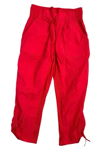 The Nakato II capri pant is made of woven stretch fabric that is light and strong. The weave is a 2-way stretch fabric that gives ease of movement, dries quickly, wicks moisture and has a UPF rating 50+. These features make this pant versatile, great for travel and various outdoor activities. Features Double waistband with elastic Rib knit inserts at inseam and waistband Side adjustment at bottom hem Reflective logo Red-ish coral in color EUC - one tiny scuff mark on back ankle (circled in a photo). Size XS