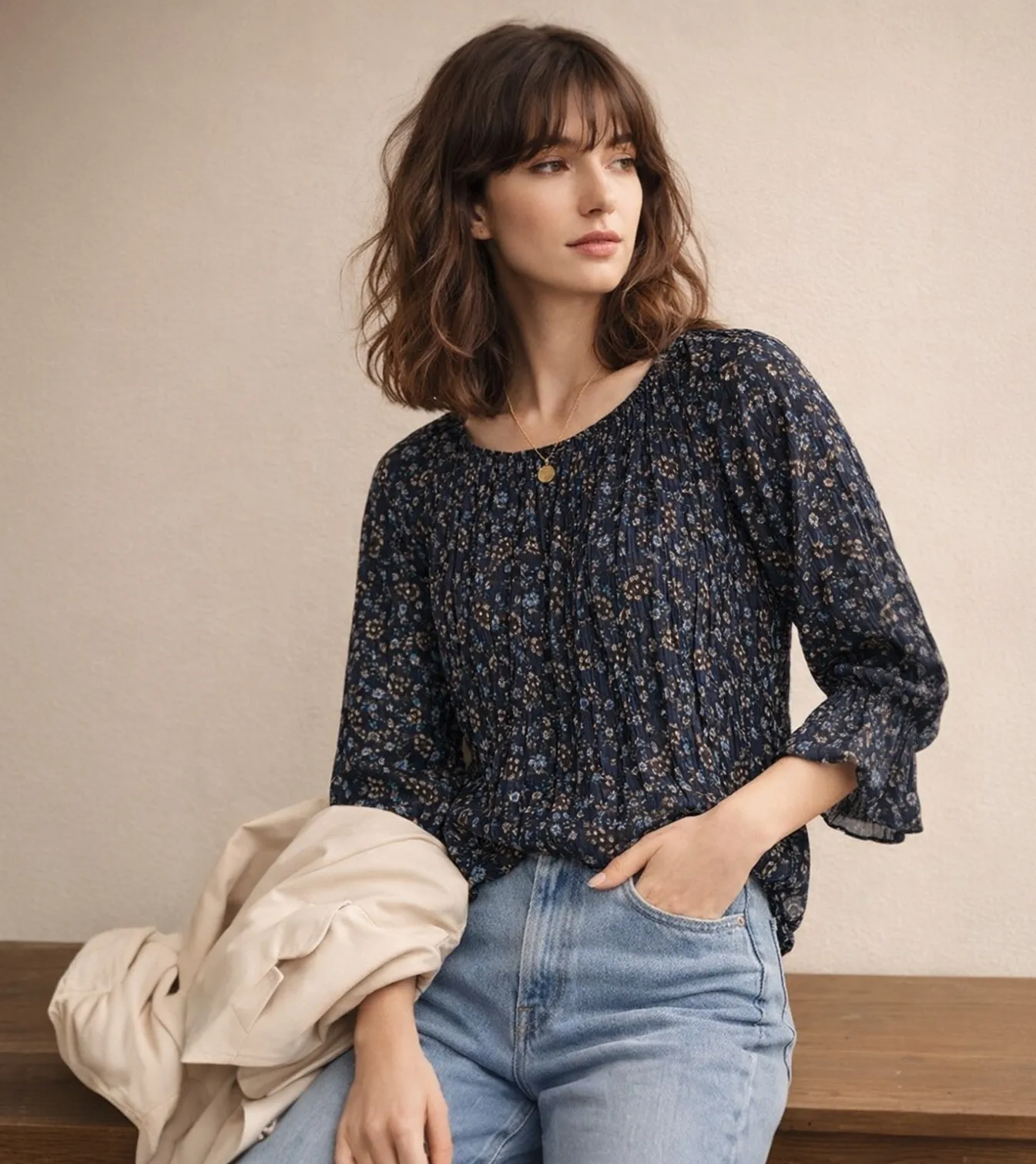 Please note: Model image is AI generated and used for styling reference only. There may be slight differences from the actual item. •Measurements are pit-to-pit and mid-shoulder to hem •Colors may vary slightly due to lighting and angle. Ines de la Fressange blouse, Uniqlo Ines floral top, Parisian Chic blouse, French Girl style top, floral crinkle blouse, pleated floral blouse, navy floral long sleeve top, romantic floral blouse, cottagecore floral top, womens lightweight blouse, soft boho floral top, elastic cuff blouse, relaxed fit floral blouse, Parisian style womens top, casual chic blouse