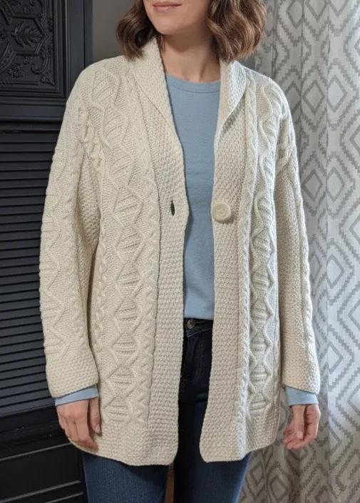 Inis Crafts 100% merino‎ wool Aran Ireland Fisherman shawl cardigan sweater L Size L - $110 - From Tiffany