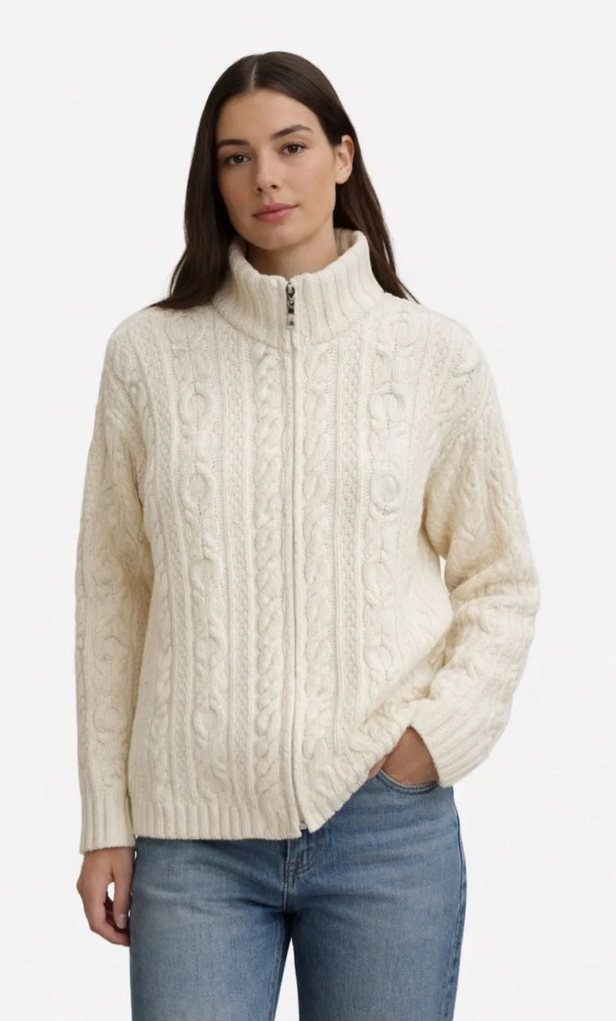 Beautifully crafted Inis Crafts cable knit sweater made in Ireland from 100% merino wool. This classic cream knit features traditional Aran-style cable detailing, a cozy zip-up mock neck, and a timeless heritage look that never goes out of style. A perfect cold-weather staple—warm without being bulky and ideal for layering with denim, trousers, or over a button-down for a polished, classic feel. ✨ Authentic Irish knitwear ✨ Rich cable knit texture ✨ Zip-front mock neck ✨ Soft, warm merino wool ✨ Made in Ireland Excellent Preloved Condition Tagged Size: Small Please refer to measurements for best fit. Measurements (approx., laid flat): Pit to pit: 21.5 in Length: 25 in • 100% Merino Wool • Made in Ireland • Dry clean or hand wash cold recommended inis crafts, irish wool sweater, merino wool sweater, cable knit sweater, aran sweater, cream knit sweater, heritage knitwear, made in ireland, zip neck sweater, cozy winter sweater, classic knit, timeless style, minimalist wardrobe, capsule sweater, warm, winter, coastal