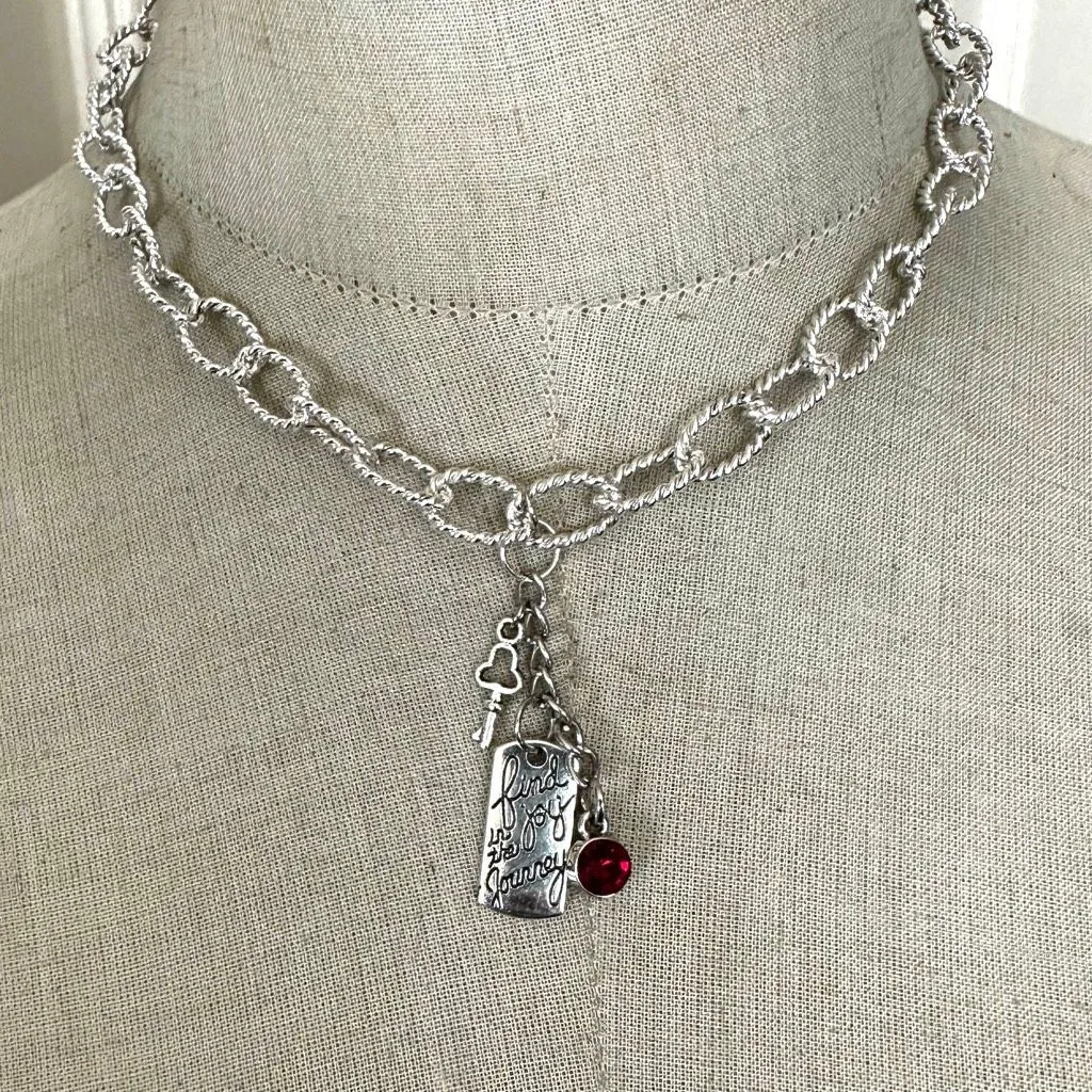 ” ❤️✨ Beautiful silver-tone necklace with a twisted rope chain and inspirational charms — a script tag that reads “Find joy in the journey,” a vintage-style key, and a deep red faceted crystal charm. Lightweight and easy to wear — perfect layered with other chains for a casual-chic look. Great gift for someone starting a new chapter or as an uplifting daily reminder. ✨ Same or next day shipping & packed with care. Photos are part of the description. Reasonable offers welcome! 💕 Bundle to save! Free gift with purchase of 3+ items. 😊 Price: **$18** Condition: Excellent pre-owned 💎 Styling tip: Layer with a shorter delicate chain or a chunky bracelet for an effortless stacked look. #charmnecklace #inspirationaljewelry #silverchain #layeringnecklace