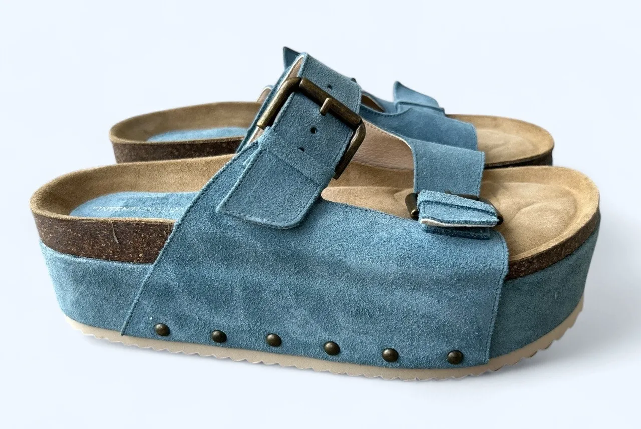 Free People x Intentionally Blank Blue Suede Platform Sandals Size 41 Step up your style with these statement platform sandals from Free People’s collaboration with Intentionally Blank. Crafted from soft blue suede with antique brass buckle accents, these shoes combine retro 70s vibes with modern comfort. Perfect for pairing with wide-leg jeans, midi skirts, or summer dresses. Details: • Brand: Free People x Intentionally Blank • Size: EU 41 (fits approx. US 10–10.5) • Color: Dusty blue • Material: Genuine suede upper, wood-look platform midsole, synthetic sole • Features: • Double adjustable buckle straps • Stud detailing along the sides • Cushioned suede footbed • Platform wedge design for lift and comfort • Condition: NEW never worn/ no box Approximate measurements: • Platform height: 2.5" boho platform, retro sandals, suede slides, chunky flatform, 70s revival, Free People shoes, Intentionally Blank, festival style, Birkenstock inspired, blue suede sandals Summer Vacation vintage inspired