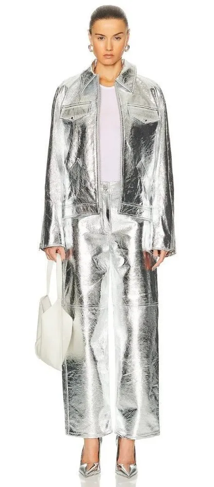 INTERIOR STERLING PANTS IN LAMINATED LEATHER Made from soft laminated lamb leather with a workwear-inspired five-pocket design, these Interior pants stand out with a wide, straight cut. INTERIOR "The Sterling" high-shine leather carpenter pants with an easy fit Approx. 32'' inseam Mid-rise; sits high on hipZip fly with button closure 7-pocket styling includes two cargo slip pockets Crinkled and coated lambskin Dry clean only Self: 100% lambskin LiningL 100% cupro Our Style No. IIOF-WP9 Manufacturer Style No. 714INT-PS24 Color: Aluminum MSRP: $1,980.00 Size & Fit Fits true to size, take your normal size High-rise, cut for a straight-leg fit Lightweight, non-stretchy fabric Features: • Currently on FWRD but sold out in this size Size: Womens 2 Condition: New With Defects minor damage at lower back left calf, not ver noticeable Tags: farfetch, night out, party, event, date night, sexy, bodycon, graduation, mini, cocktail, going out, bright colorful, fancy, wedding guest, sheath, brunch, bachelorette, simone, rush, sorority, designer, luxury, high end, runway, metallic, baggy,