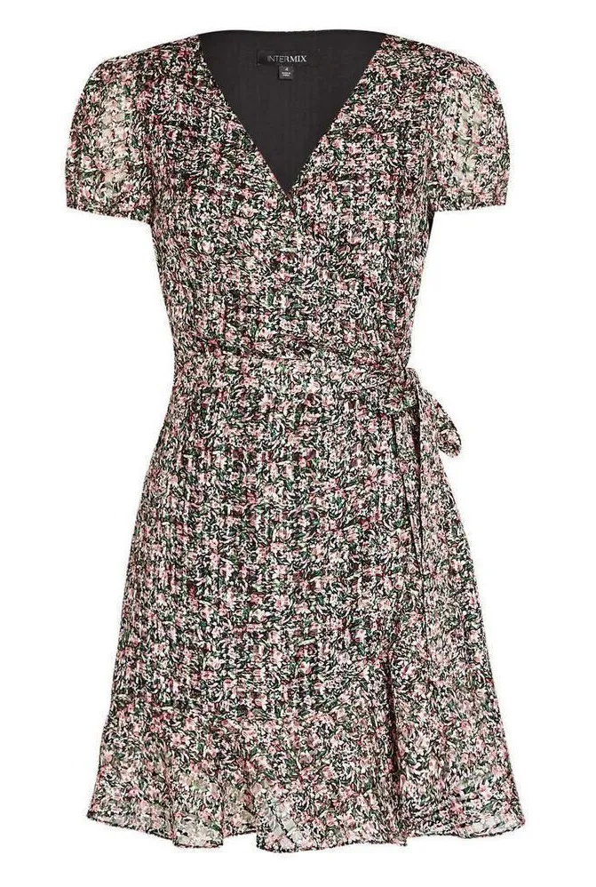 Made from a lightweight blend of silk and cotton, this dress ensures breathability and comfort on warmer days. The charming floral print adds a vibrant touch, while the ruffle hemline adds a playful flair. The fully lined design provides a smooth fit, and the surplice neck and cap sleeves offer a feminine silhouette. Complete with a tie closure on the side, this wrap dress allows you to adjust the fit to your liking. Brand: Intermix Department: Women's Size: 4 Color(s): Multicolor Condition: New Without Tags Measurements: Bust: 17.5” flat Length: 33” Floral, Casual, Chic, Stylish, Preppy
