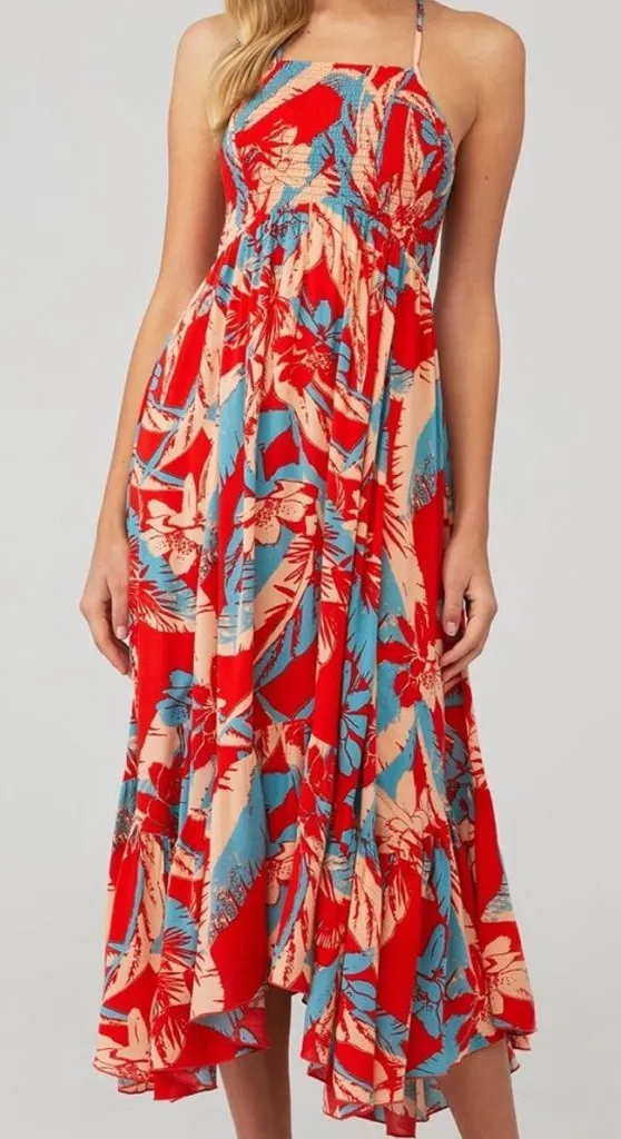 Intimately Free People Heat Wave Tropical Print Smocked Maxi Dress Size XS Handkerchief Hem High Ne... Show more