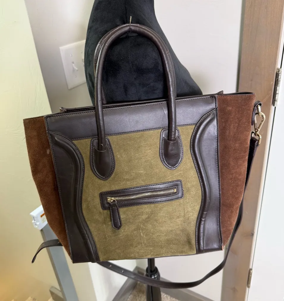 Inzi Tri-Color Suede Leather Tote Bag Purse Shoulder Neutral Brown Olive Shopper Green - $68 - From Abbey