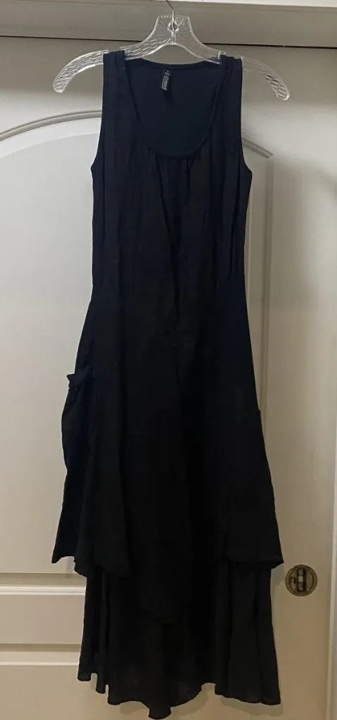 Brand: Not clearly readable from tag (Made in Italy dress). Style: Womens sleeveless black dress with an asymmetrical layered hem and relaxed lagenlook silhouette. Design details: Scoop neckline, ribbed knit bodice, woven skirt panels, large side pocket with ribbed trim, pull-on style. Color: Black. Size on tag: S (Small). Country of origin: Made in Italy. Occasion: Casual, artsy, boho, minimalist styling; can be layered for multiple seasons.