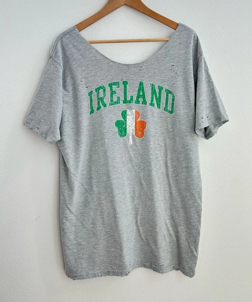 Ireland Lightly Destroyed short sleeve T-shirt. soft hand feel knit fabric with nicely worn washed look. holes, rips, pulls throughout the body.....looks cool! large bold Art at front body. relaxed Tee fit! 🌟size L (men's) see measurements for desired fit. 31" top to bottom hem. 22" under arm. Next day shipping❣️