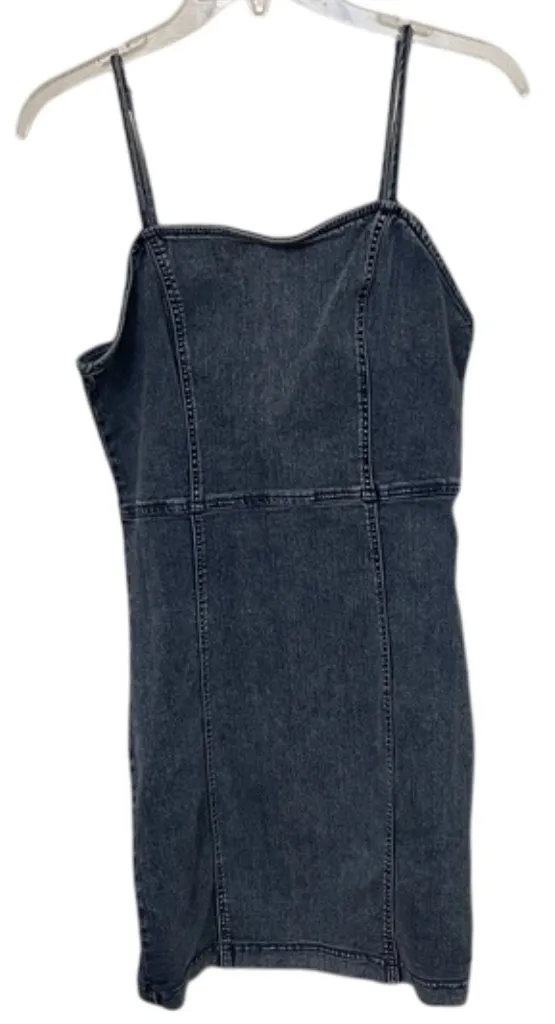 Chic, medium wash, 45% cotton, 30% rayon, 23% polyester, 2% spandex, denim, blue jean, mini dress by... Show more