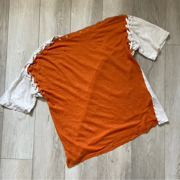 IRO 100% Linen Colorblock Lace Up Crop Top in the color Orange / White. Short sleeve. Boat neck. Lace up detailing along sleeves. Breathable, lightweight. Oversized fit. Cropped length. In great pre-worn condition, no major issues. Size xxsmall, can fit up to a size small. 100% linen.