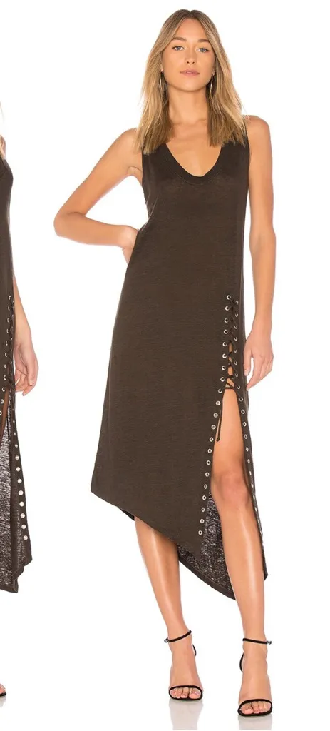 Gorgeous tank style knit dress by designer label IRO. "Karossi" style in "Charcoal" (a muted olive brown) 100% linen slub jersey knit. Scoop neck, unfitted cut, grommet lace-up detail slit at side front, and angled hem. Bust 38-43“, hips 39-44“, length at longest point 56.5“. Size M, great preowned condition. All measurements taken with garment lying flat & doubled where applicable.